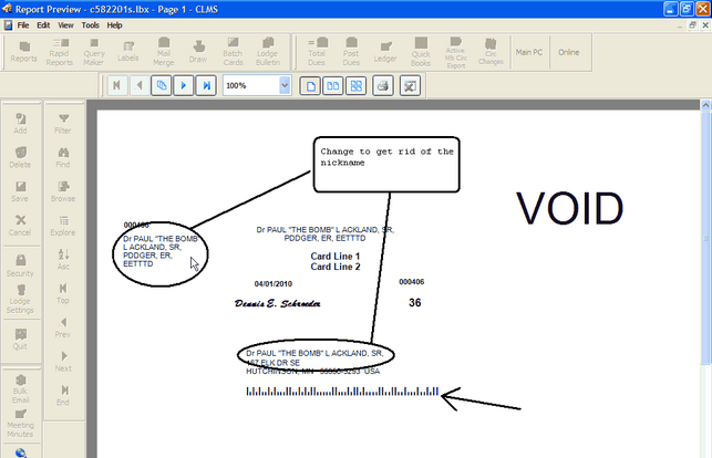 Notice the name field on 3 locations of the card output. The name includes the members nick name, we will remove this from the card and get rid of the barcode. We will replace the name fields by using a built in function see Report Functions . Close the report so that we can proceed to the next step.