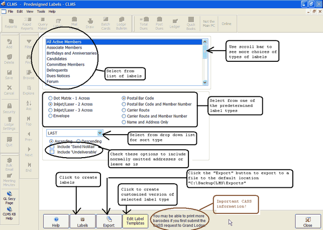 This label screen is for the "All Active Members" labels, however most of the other label selections contain the same options and settings. Select from the type of labels you want to print Dot Matrix, Inkjet/Laser or some other type. You can change the field that the labels are sorted by and change it to ascending or descending order, can export or print the labels.