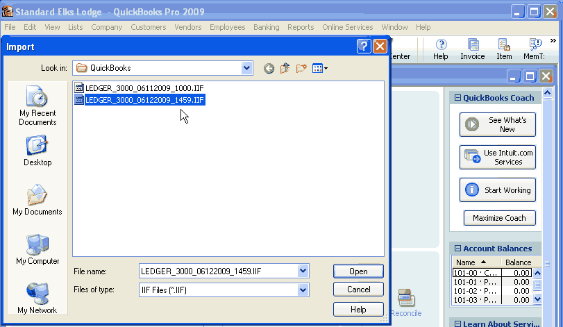 An "Import" box will appear select the file you wish to import from the "C:\BackupCLMS\QuickBooks" folder.