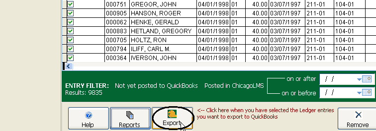 To display entries for a particular member you can type the member's number in the field provided at the lower left of the screen just to the right of the date picker controls. Only ledger entries that meet the criteria you have selected in the Entry Filter area will be shown in the grid. Ledger entries that have been previously posted to QuickBooks or have been removed using the 'Remove selected entries' button will not be shown or displayed in the grid regardless of the criteria you set up in the date picker controls or member number field. This prevents entries from being posted more than once to QuickBooks.