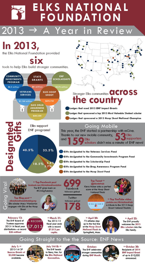 Here's a quick look at how the Elks National Foundation helped Elks build stronger communities in 2013.