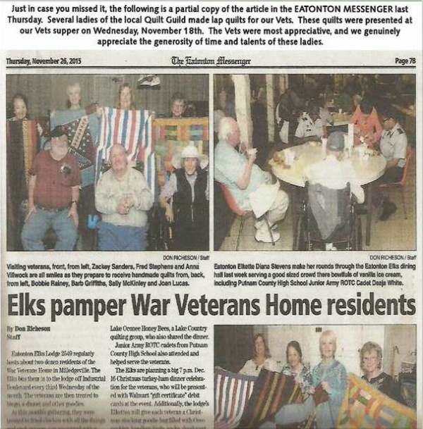 Eatonton Elks Lodge 2549 regularly hosts about two dozen residents of the War Veterans Home in Milledgeville. The Elks bus them in to the lodge off Industrial Boulevard every third Wednesday of the month. The veterans are then treated to bingo, a dinner and other goodies.