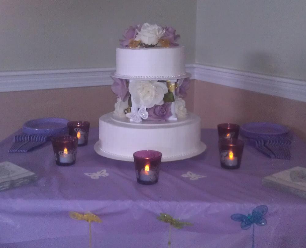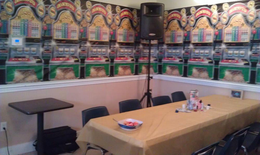 Hall decorated showing the tablecloths and chair covers available for rent for your event.