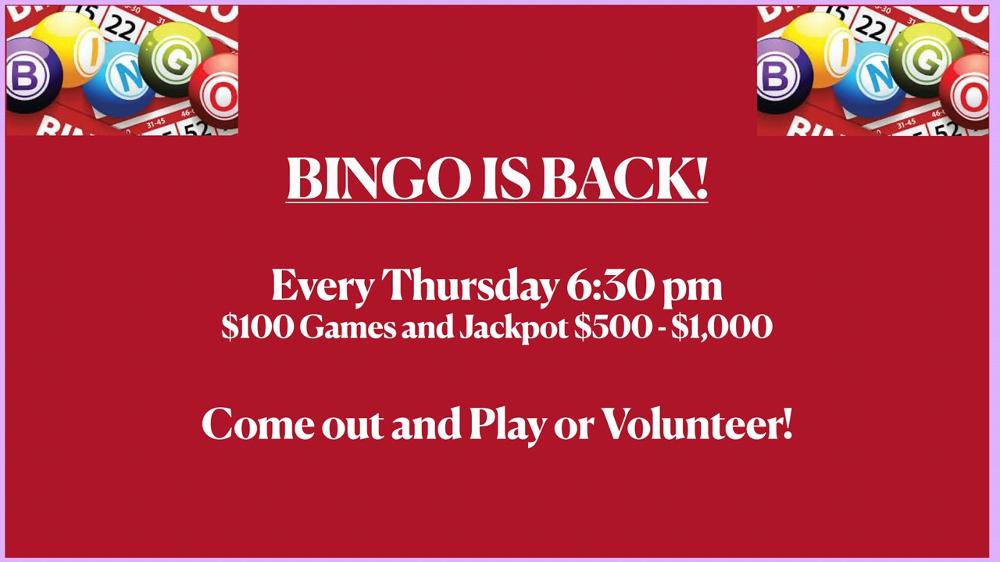 Doors open at 5pm and Bingo starts at 6:30pm.