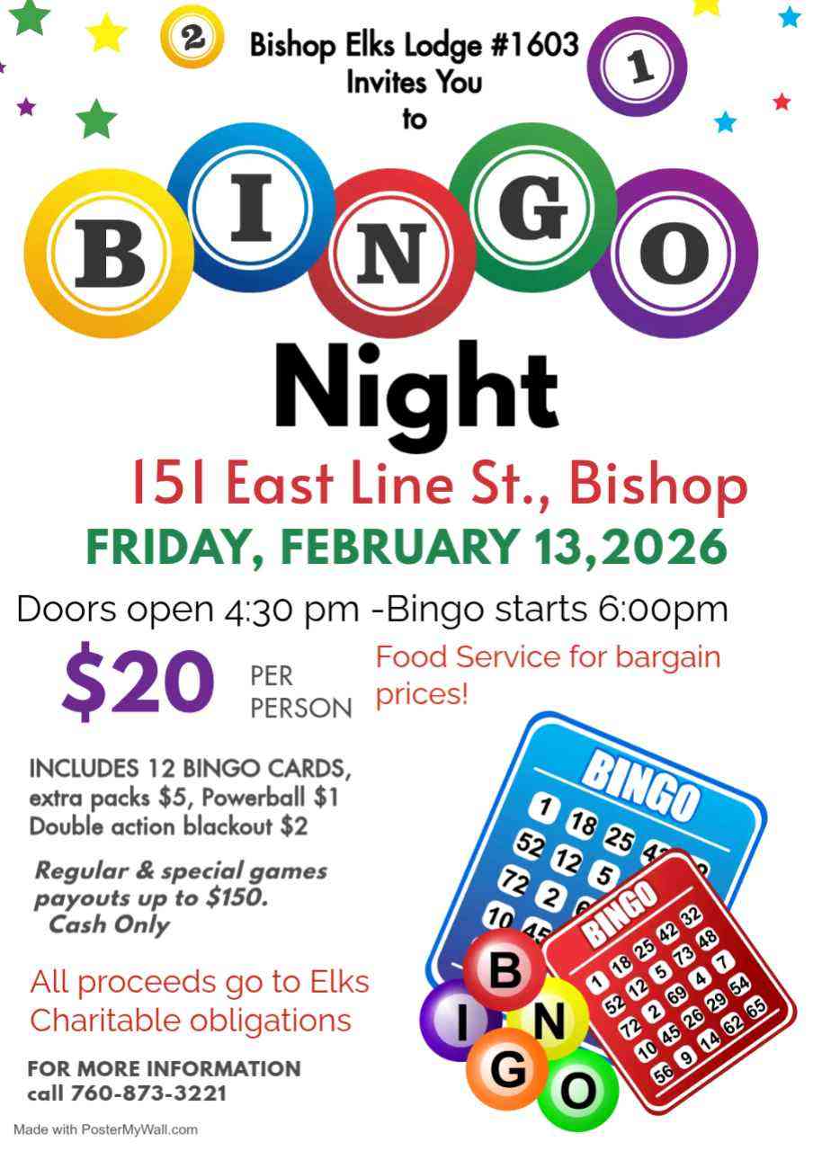 We have Bingo twice a month. For details visit Calendar with Bingo Information