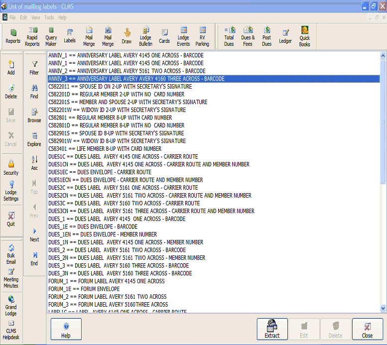 The List of mailing labels screen is displayed where you will select the label that you desire to edit from the list by left-clicking on the label within the list. Then click on the "Extract" button if this is the first time you are editing a particular label. If you have edited the desired label before then you will proceed to Step 3 directly as the label will already have been extracted.