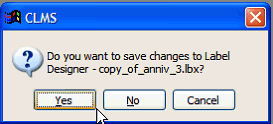 Once the label has been edited to your satisfaction, close the label edit screen by clicking on the gray "[X]" button in the upper right-hand corner of the screen and you will be prompted to save. Simply click the "Yes" button as shown in the image below. Your edited label will be used within the system in lieu of the stock label that comes with Chicago Lodge Membership System.