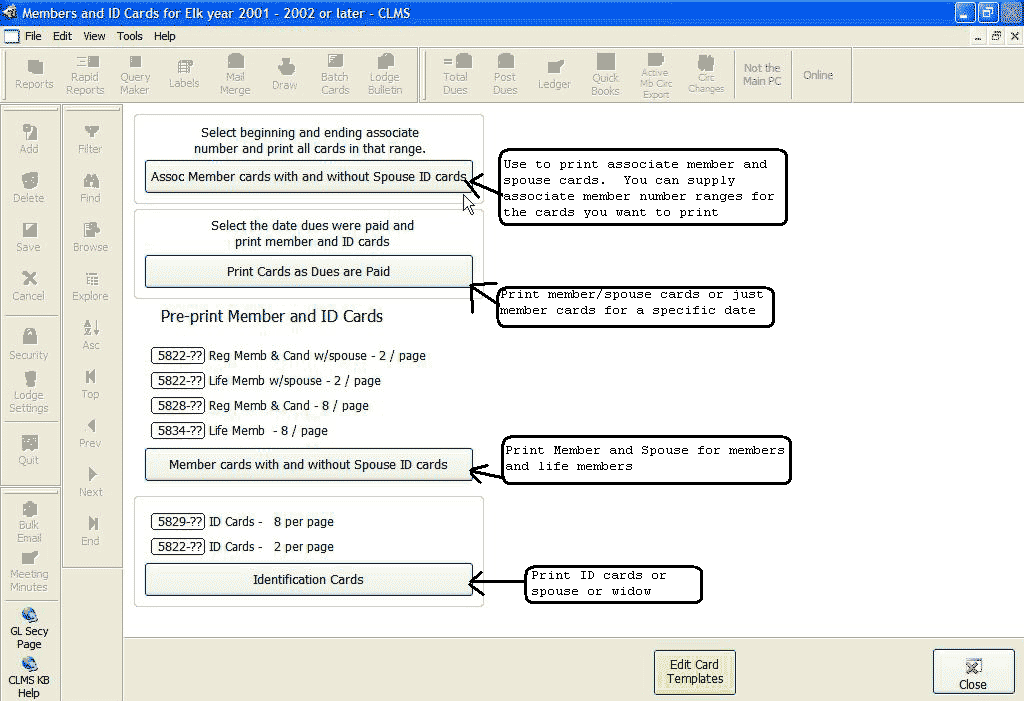 Chicago Lodge Membership System (CLMS) provides lodge secretary's the ability to print both membership cards for members and id cards for family members. CLMS has been designed to support the two most common types of stock in use by the members of the Elks, which are the 2 cards per page and 8 cards per page.