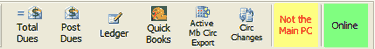 The "Dues" toolbar provides centralized access to Lodge Secretaries accounting functionality as well as the "Active Mb Circ Export" and "Circ Changes" files that can be sent to and from the Grand Lodge. This toolbar is located in the top right of the system screen when Chicago Lodge Membership System is first opened.